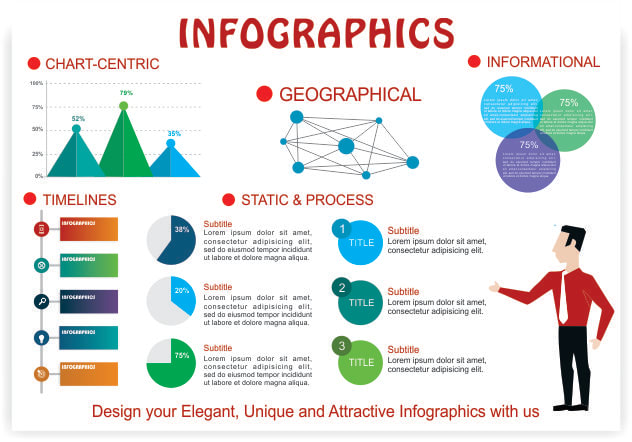 We will design Informational, Statistical, Comparison, Timeline, Hierarchical Graphical and Geographical Infographics in attractive, unique, modern and elegant design with multiple Concepts and revisions.